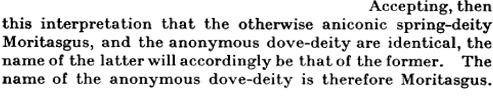 Again, in our statuette, the sacred oak branches bearing the doves, remind us further that the dove-deity (Moritasgus) was, ipso facto, also a tree deity, who appears here as an oak spirit. (pg. 152)