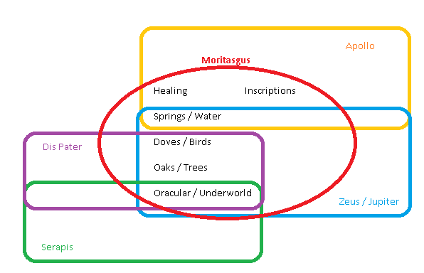 We can summarise the characteristics of Moritasgus as relating to healing, springs, doves, trees, and some link to the underworld. In addition we inscriptions linking him to Apollo.
